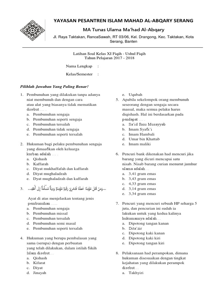 Contoh Soal Latihan Fiqih Ushul Fiqih Kls 11 2017 Bab 1 2