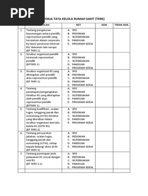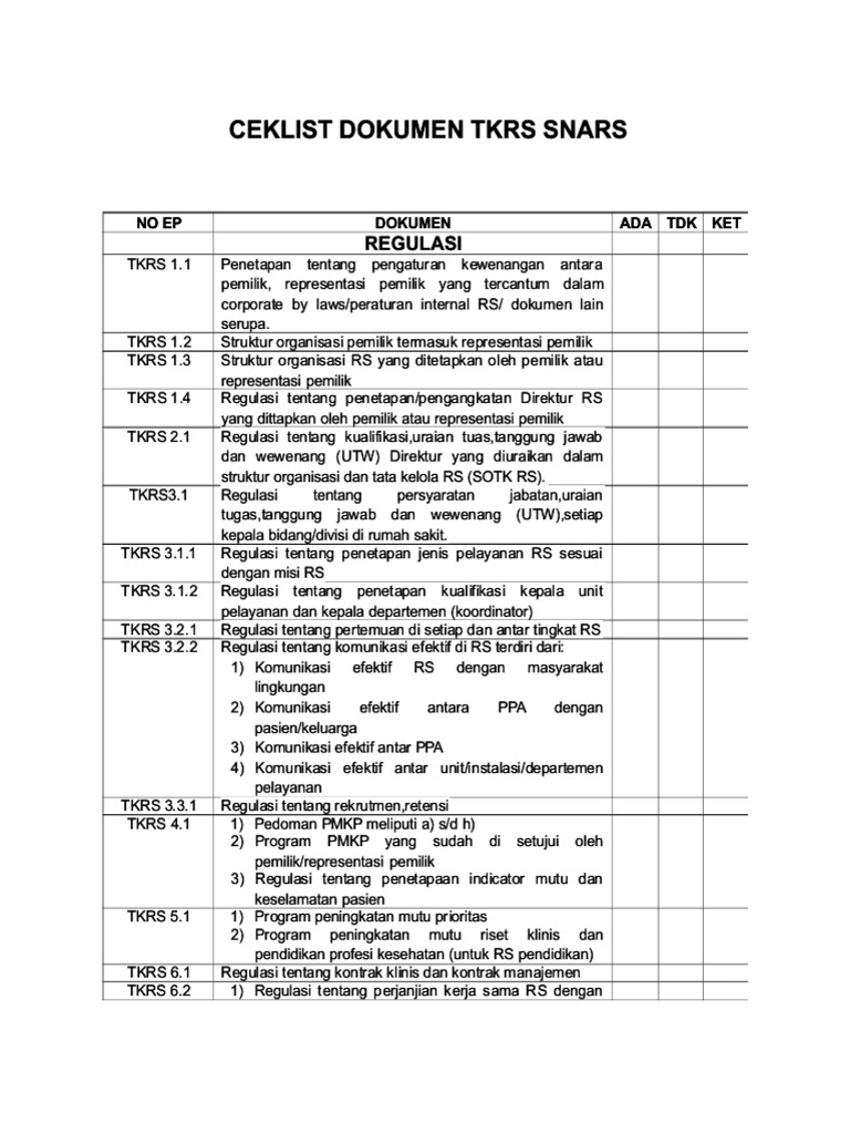This document was uploaded by user and they confirmed that they have the permission to share it. DW Standar TKRS 31 261 Direktur Rumah Sakit dan para kepala bidangdivisi di rumah sakit mengidentifikasi dan merencanakan jenis pelayanan klinis yang dibutuhkan untuk memenuhi kebutuhan pasien yang dilayani rumah sakit tersebut. Document 6 Pdf Contoh Daftar Regulasi Snars Standar Tkrs 1 Tkrs 1 Ep 3 Tkrs 9 Ep 1 Regulasi Corporate Bylaws Pengaturan Kewenangan Representasi Course Hero Ceklist Dokumen Tkrs Snars Oks Ceklist Tkrs.