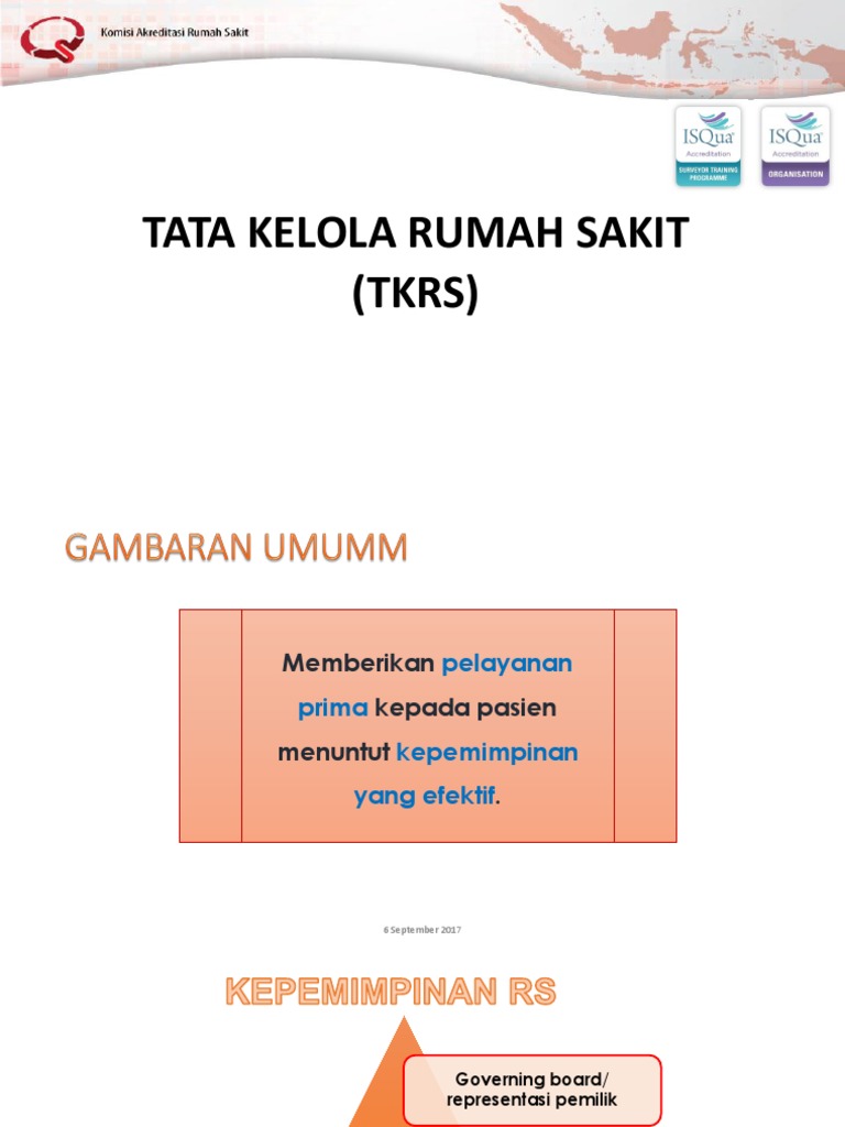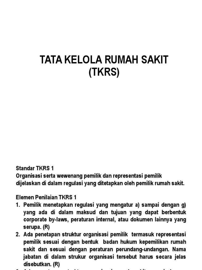 TKRS merupakan Program Induk 2. If you are author or own the copyright of this book please report to us by using this DMCA report form. Standar TKRS 1 Organisasi serta wewenang pemilik dan representasi pemilik dijelaskan di dalam regulasi yang ditetapkan oleh pemilik rumah sakit.