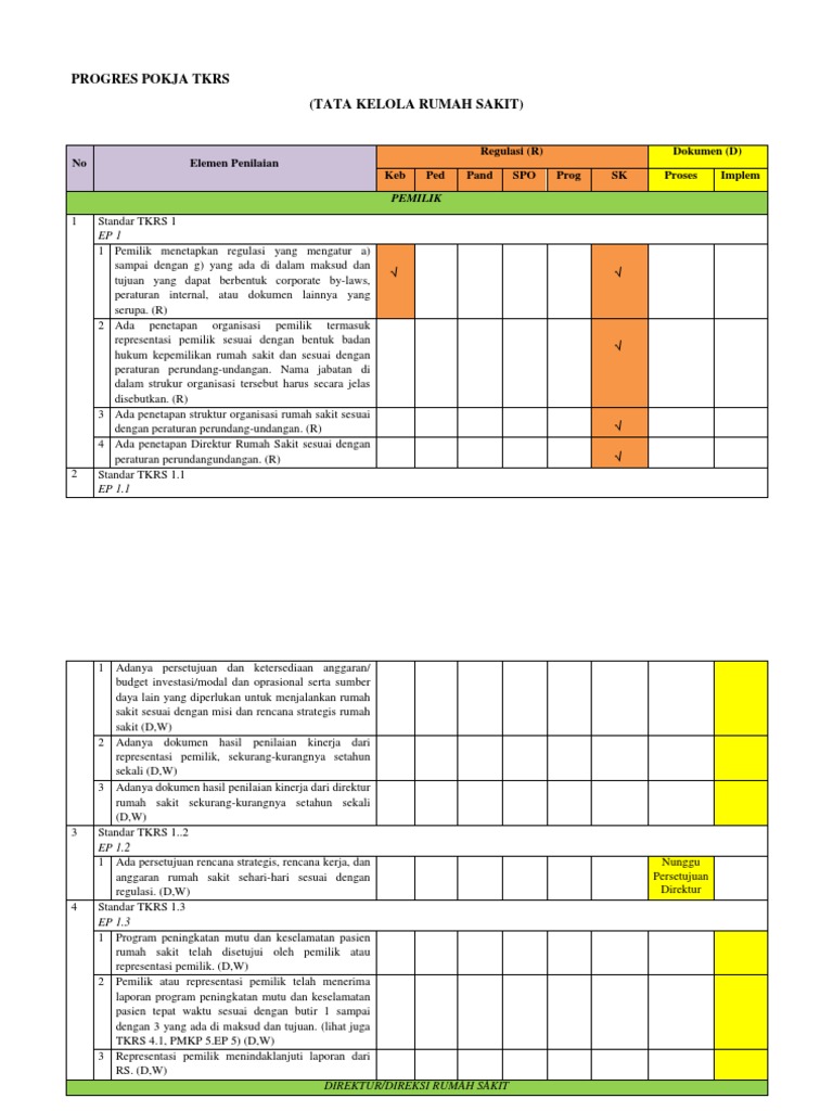 NO EP DOKUMEN ADA TDK KET DOKUMEN TKRS 111 1 Bukti tersedianya anggara investasi dan operasional dalam RKARBADPADIPA dan dokumen lain serupa 2 Bukti tentang persetujua RKARBADPADIPA oleh pemilik atau representasi pemilik TKRS 112 Bukti tentang hasil penilaian kinerja representasi pemilik TKRS 113 Bukti tentang hasil penilaian kinerja Direktur RS TKRS 121 Bukti Misi persetujuan misi review misi secara berkala publikasisosialisasi misi RS TKRS. TKRS SNARS Standart Nasional Akreditasi RS Indonesia 1 Sep 2018. Inilah pembahasan lengkap terkait contoh dokumen tata kelola rumah sakit.