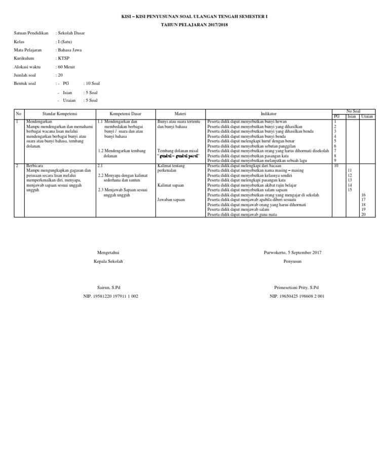 Soal Uts Bahasa Jawa Kelas 1 Sd Semester Ganjil