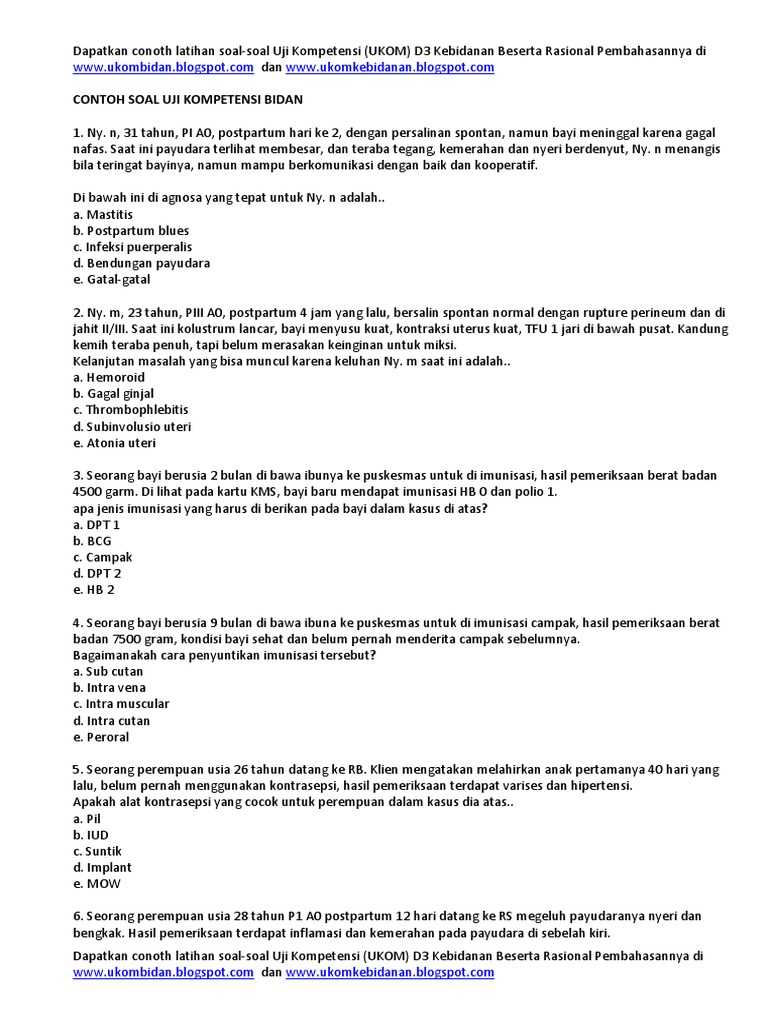 0546 Soal Uji Kompetensi UJI KOMPETENSI. Buku Kumpulan Soal-Soal Uji Kompetensi Bidan ini kami susun dalam rangka menjawab persoalan diatas. Contoh soal ukom d3 bidan dan kunci jawaban tahun 2019 2020.