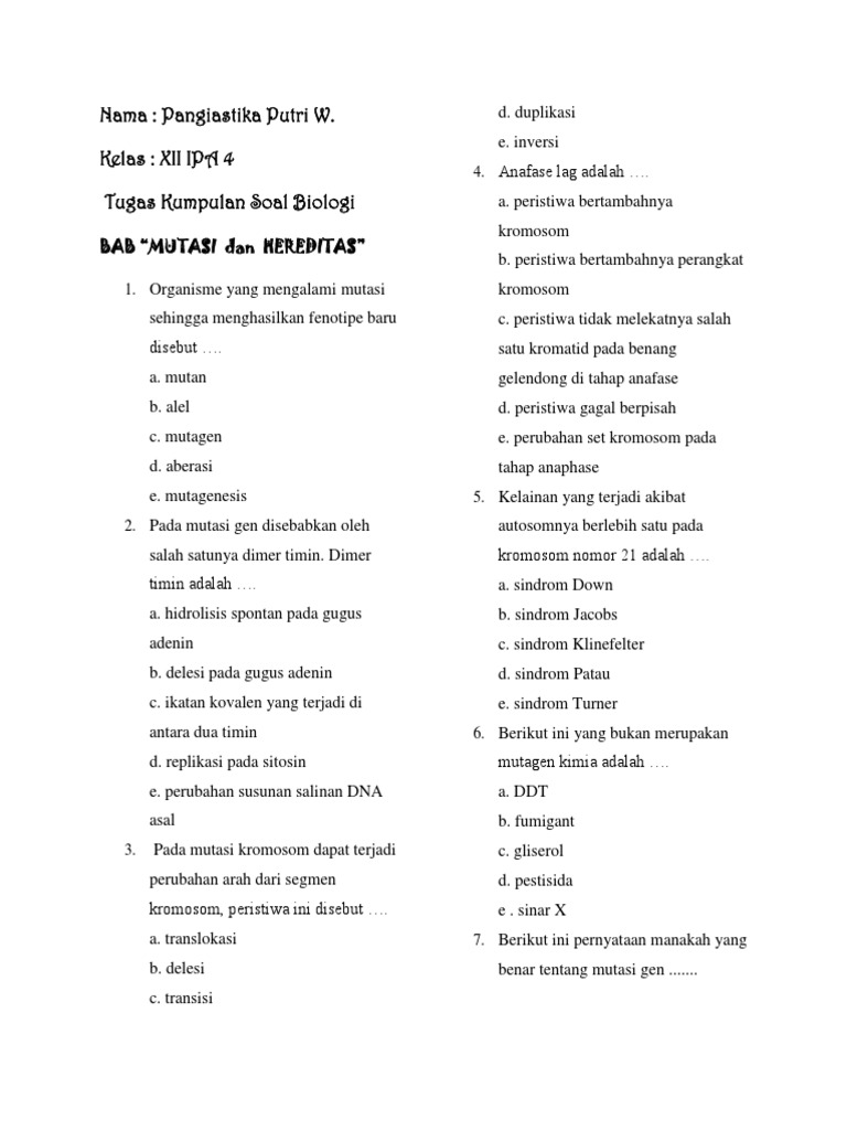 Rangkuman Materi Contoh Soal Bab Mutasi dengan Pembahasan yang dibahas dengan jelas mengenai berupa soal-soal UN SBMPTN Biologi SMA dari beberapa tahun. Oleh samhis setiawan Diposting pada 5 Februari 2021. Kunci Jawaban Biologi Sma X.