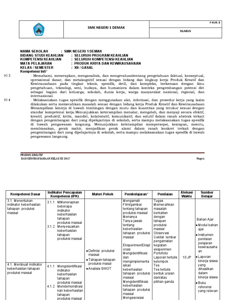 Memahami menerapkan menganalisis dan mengevaluasi tentang pengetahuan faktual konseptual operasional dasar dan metakognitif sesuai dengan bidang dan lingkup kerja Produk Kreatif dan Kewirausahaan pada tingkat teknis spesifik detil dan kompleks berkenaan dengan ilmu. Silabus mata pelajaran merupakan salah satu perangkat pembelajaran yang sangat penting bagi seorang guru karena dengan memiliki silabus maka seorang guru dapat dengan mudah membuat perangkat pembelajaran lainnya seperti Rencana pelaksanaan pembelajaran yang di buat berdasarkan dari silabus. Produk Kreatif dan Kewirausahaan.