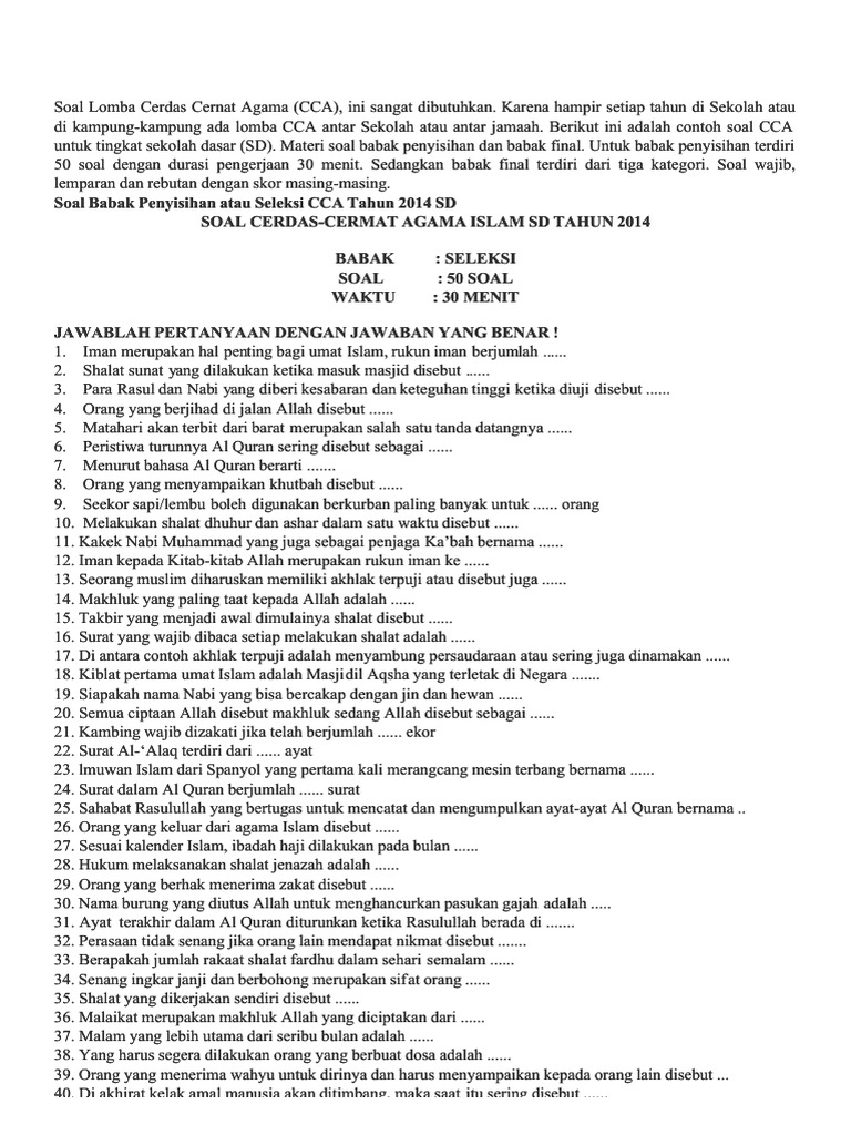 Soal cerdas cermat pai sd 2017. Soal Cerdas Cermat Agama Cca Islam Agama Islam Iman. Id Change Language Ubah Bahasa. Berikut ini adalah soal latihan ukg 2015 smk semua bidang yang merupakan kumpulan file dari berbagi sumber smk uji kompetensi guru ukg 2015 tentang soal cerdas cermat pai sd beserta jawabannya yang bisa bapak ibu gunakan dan diunduh secara gratis dengan menekan tombol download biru dibawah ini.