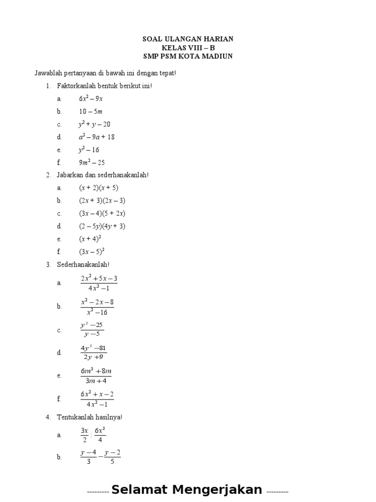 Soal Ulangan Harian Matematika Kelas Viii Smp Psm Kota Madiun