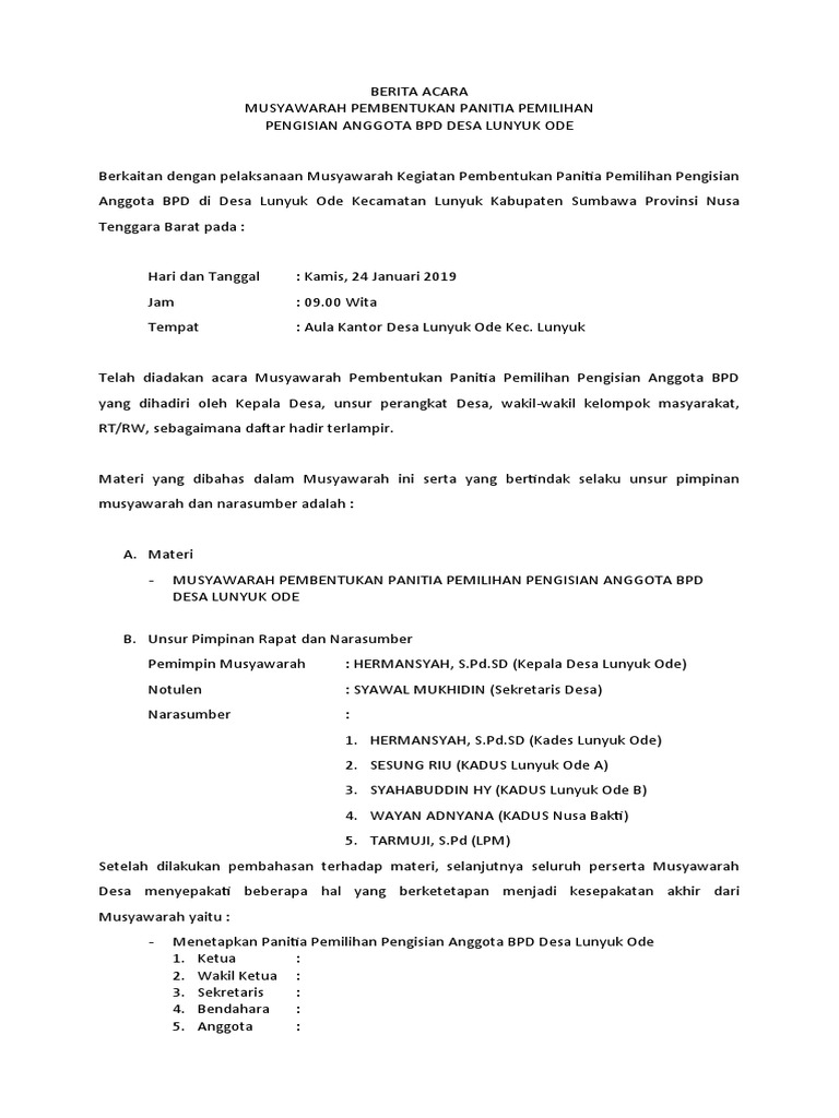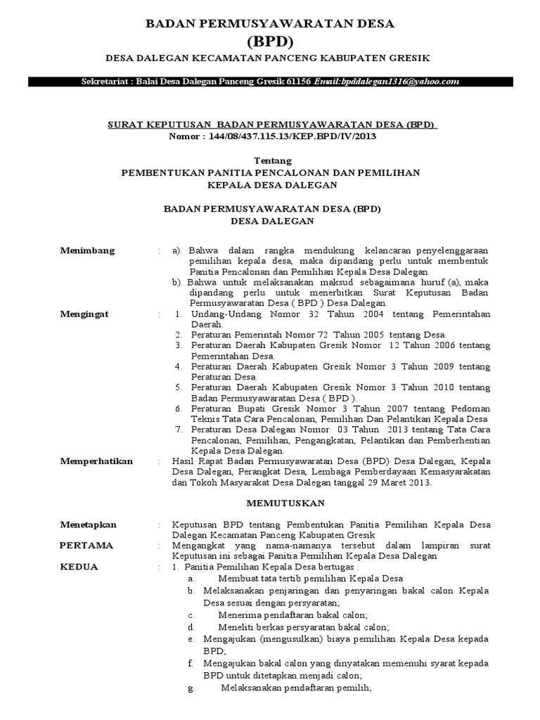 Desain ini dalam bentuk format File. Surat Keputusan Panitia Penetapan Calon Kepala Desa Terpilih Desa Panitia Haflah Akhirussanah Tahun 2013 Musrenbang Di Kecamatan Sawa Bupati Konut Sdm Wajib Ditingkatkan. Pembahasan Mekanisme Pemilihan BPD Adapun hasil musyawarah desa diperoleh kesepakatan sebagai berikut.